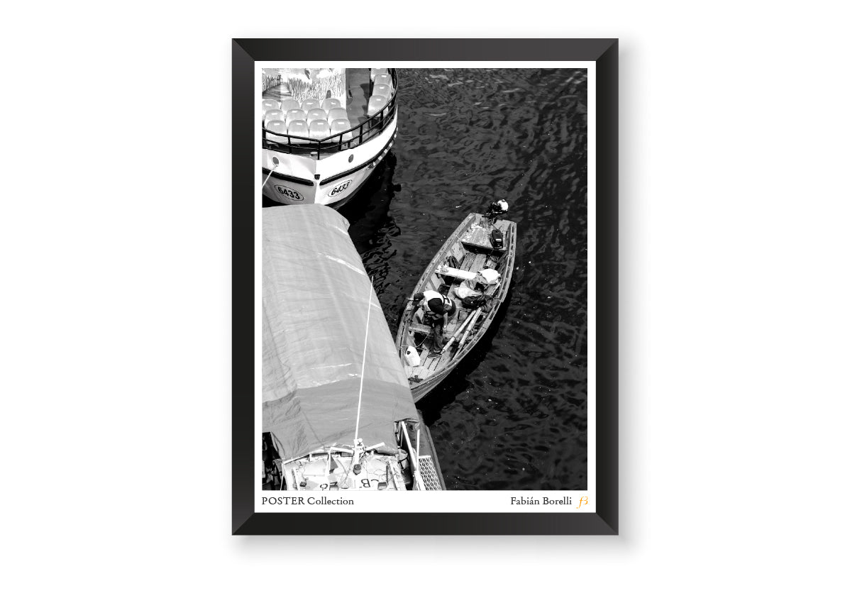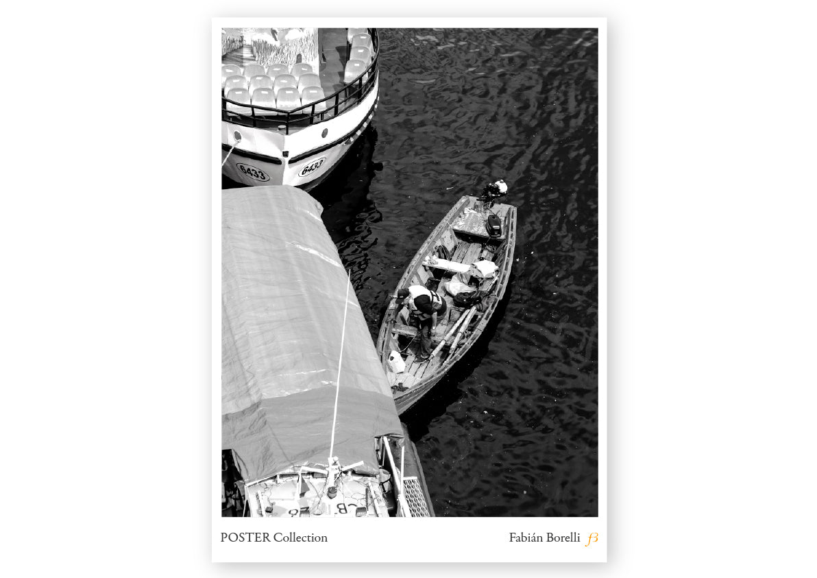 Un pescador solitario maniobra su bote entre embarcaciones turísticas, rodeado por estructuras hechas para el tránsito breve. Su figura inclinada, sumida en la tarea, parece ajena al bullicio flotante que lo rodea.