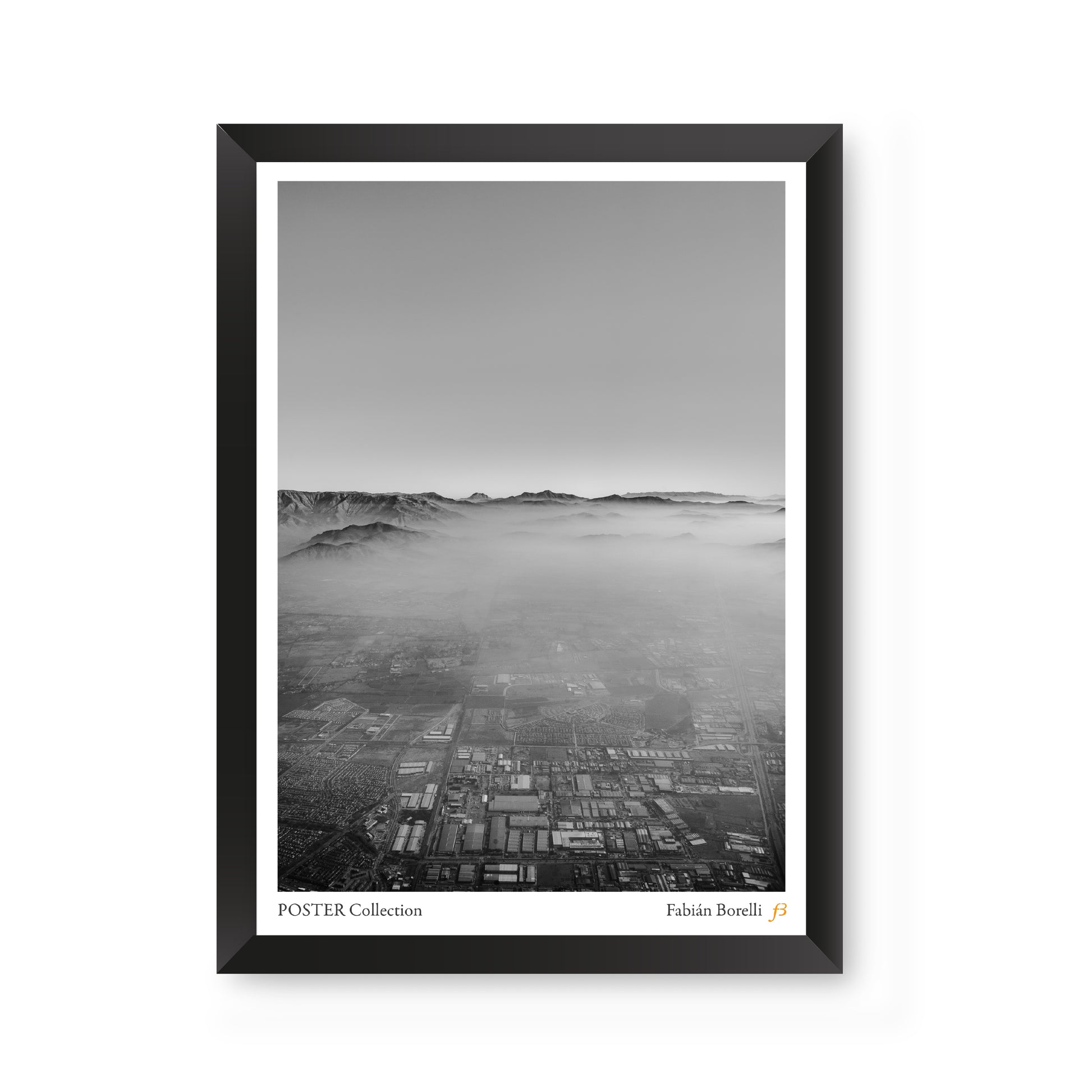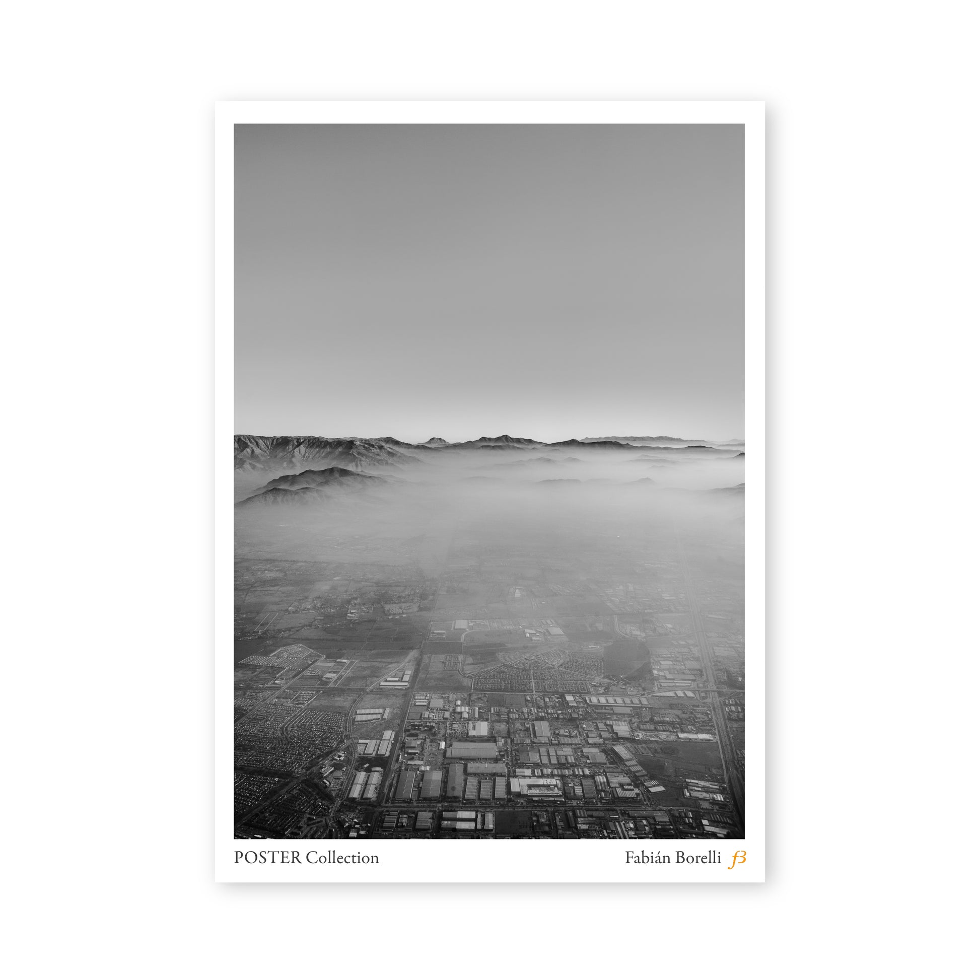 Fotografiada desde un vuelo al amanecer sobre la cuenca de Santiago de Chile, esta imagen en blanco y negro presenta una escena suspendida entre la geometría racional de la ciudad y la niebla tóxica que se acumula como una manta de indiferencia bajo la cordillera. Desde esta altura, lo humano parece diminuto y repetido: fábricas, calles, parcelas grises. Y sobre todo eso, una capa densa de smog, como si el cielo mismo observara sin intervenir.
